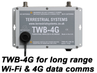 Our TWB range of high quality, world class long range terrestrial Wi-Fi and 4G data communication systems provides a high speed terrestrial Internet connection featuring automated Wi-Fi to 4G failover in dual mode systems. An Internet connection to distant Wi-Fi and 4G networks provides Internet access for all mobile and fixed devices, it also provides a secure connection for business use. The TWB-4G may be used for CANAL BOATS, CARAVANS, MOBILE SITE OFFICES, DWELLINGS & OFFICES WITH A SLOW LAND LINE in fact ANY APPLICATION that requires long range, fast, reliable 4G data communication.